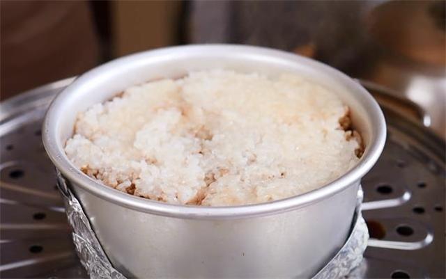 4.再舀一層糯米,按照這個順序往上摞,涼水直接上鍋蒸上30分鐘,蒸熟取出。