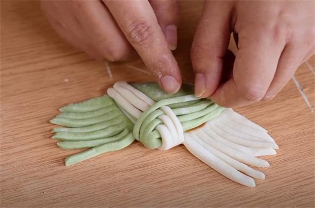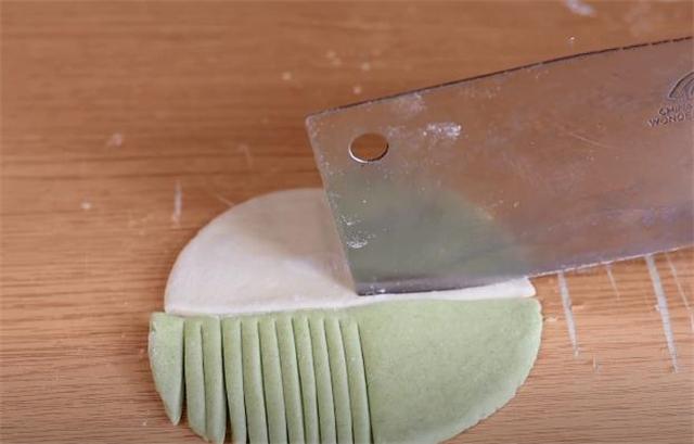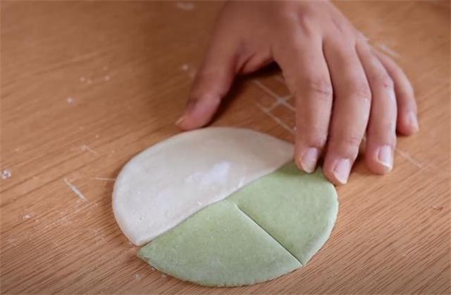 8.綠色餅皮再切一刀,注意這根部不要切斷。