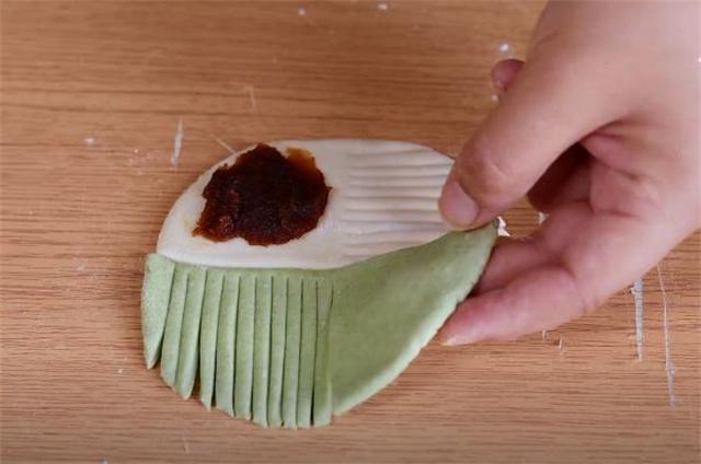 10.白色面團也按照同樣的方法,在半徑處切出細長條,放一些豆沙餡,然后把這部分的面團直接疊過去,收口處壓一壓。