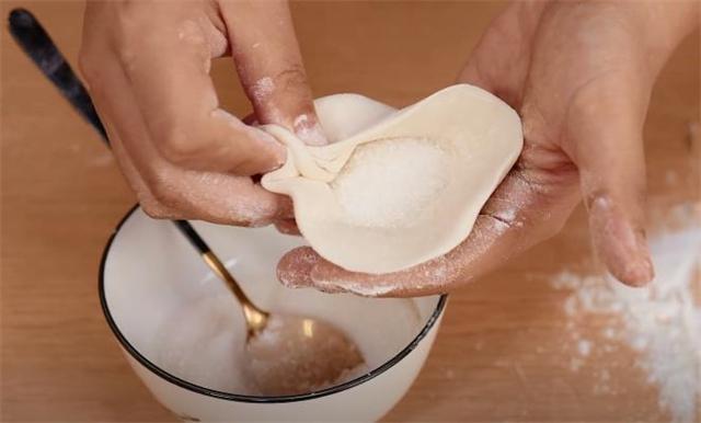 4.糖餅的餡料也很簡單,1勺白糖,慢慢的把這個收口處一定收緊了。