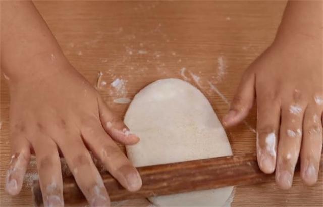 5.繼續(xù)按扁,搟成牛舌狀。