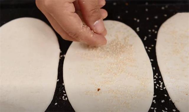 6.在餅皮表面沾一點點清水,撒上一層白芝麻,這樣烤出來的味道會更香。