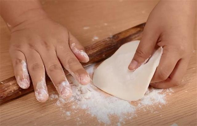 3.小面劑上面撒一些干粉防粘,垂直向下按扁,然后搟成中間厚四周薄的餅皮。