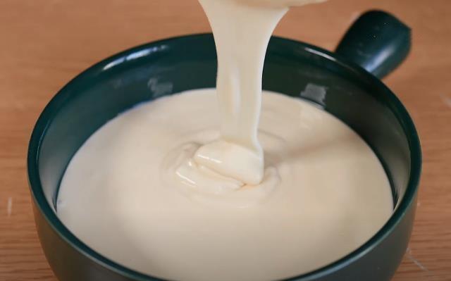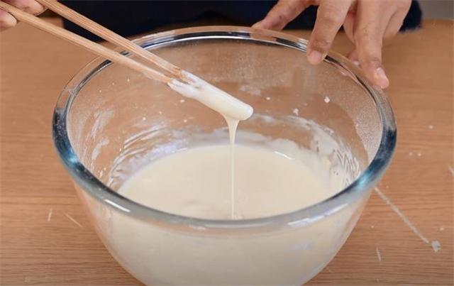 1.先準(zhǔn)備150g的牛奶,玉米油的話我們放上30g,再來30g的白砂糖,3g的無鋁泡打粉,再加入160g的糯米粉,最后攪拌好的狀態(tài)就是這種非常細(xì)膩順滑,又沒有顆粒的面糊。