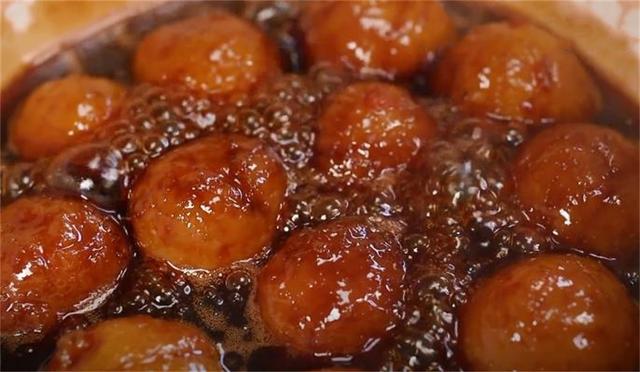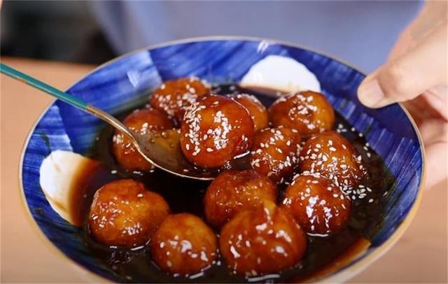 6.最后再來熬糖漿,一少部分的清水,把紅糖熬化之后,我們就要加糯米圓子了,煮至糖汁濃稠自己滿意的程度就可以出鍋了。