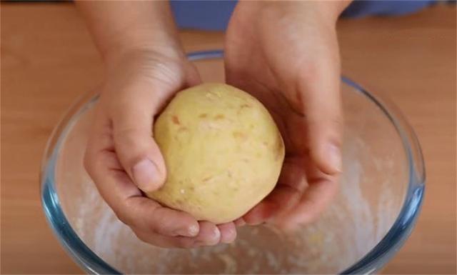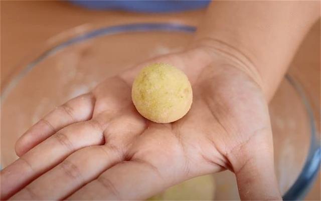 4.下劑子的時候直接揪一小塊出來,在掌心反復抓到勻稱,再搓成小圓球的形狀。