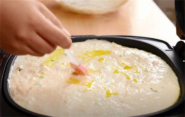 3.電餅鐺充分預(yù)熱好之后我們刷點(diǎn)油,把面糊倒進(jìn)去均勻的鋪平,表面稍微的再抹一點(diǎn)油來(lái)鎖住它的水分。