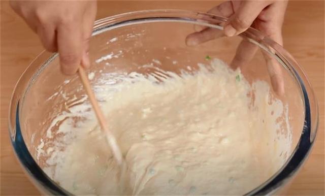 2.大約有一個(gè)小時(shí)的時(shí)間,這個(gè)面團(tuán)就已經(jīng)發(fā)酵的很好了,放上蔥花,1勺鹽,順著一個(gè)方向一直攪拌,一直把里面的氣體全部排干凈,我們這個(gè)面糊就做好了。