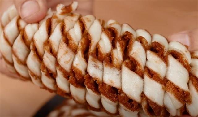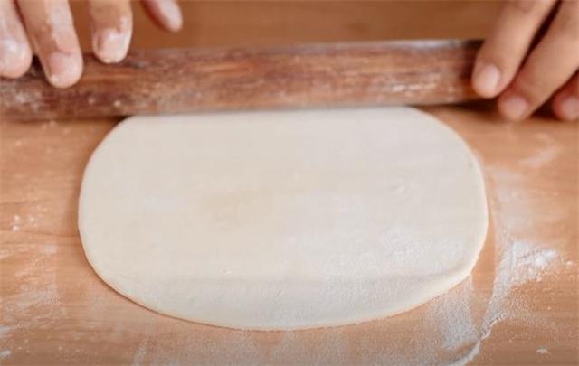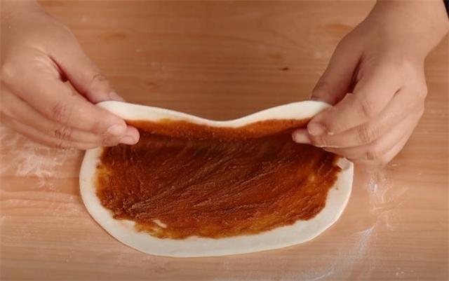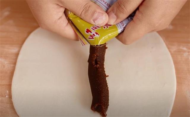 4.搟成長方形的面片之后,我們在上面擠上一些豆沙餡。