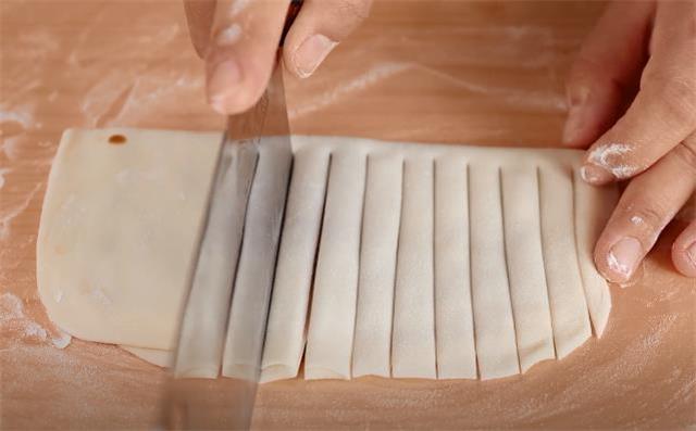 6.用刀切成長條,注意頂部的位置一定不要切斷了。