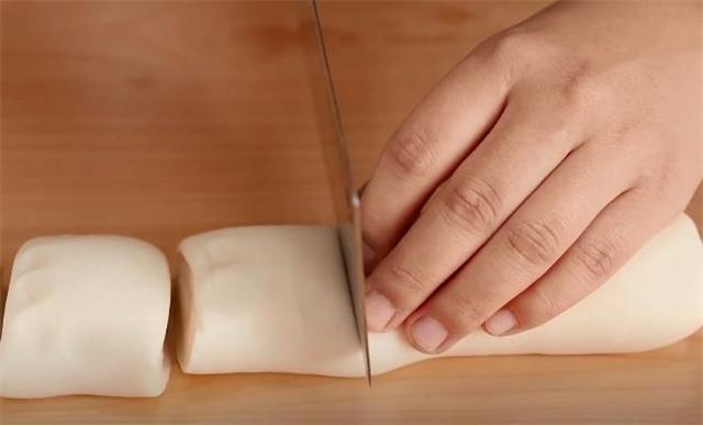 2.和面機揉的面已經非常勻稱了,我們只需要簡單的整一下形就可以,搓成長條后切成小面劑。