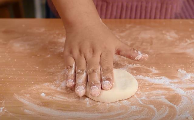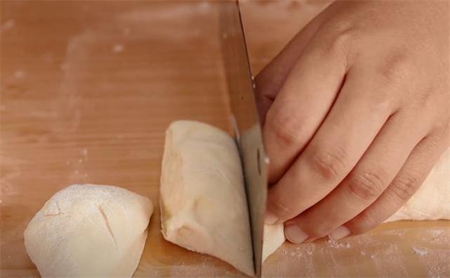 2.面團餳好之后我們先簡單的揉兩下,再撒些干面粉防粘,揉到不粘手的狀態之后我們直接搓成長條,再切成小面劑。