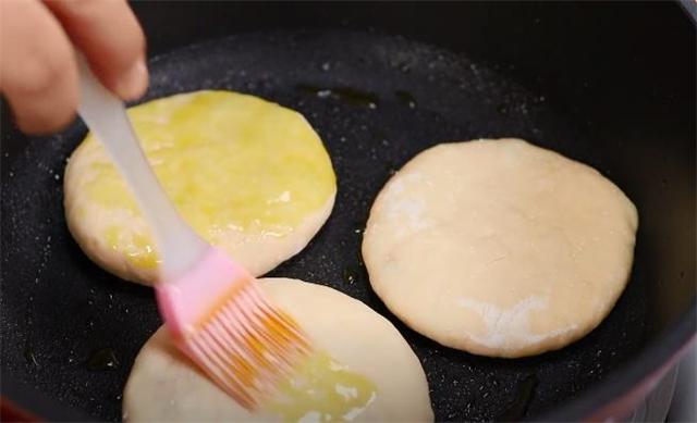 6.烙餅的時候我們先熱好鍋再刷油,這樣烙出的餅會更好吃,表面薄薄的刷一點油來鎖住它的水分。