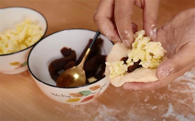 4.中間的位置填上豆沙餡,想要再好吃一點可以放一些芝士碎。
