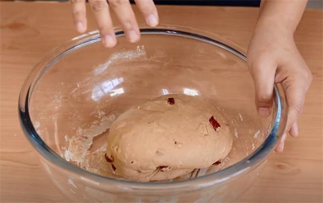 2.這時候表面已經(jīng)變得很粘稠了,而且出了很多細小的泡沫,直接倒在500g的面粉里面,攪拌成大塊的面絮,再添加少量的紅棗碎揉成光滑的面團,不管是什么季節(jié),我們都可以采用易發(fā)的形式來操作。