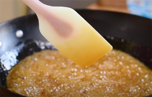 4.現在再來熬糖稀,這是150g的麥芽糖,再放上40g的白糖,加上一大勺的蜂蜜,這樣味道會更好吃,最后的時候添加180g的清水,前期盡量的不要動它,因為它會很容易的出現返沙的狀態,等到冒泡的時候,我們再攪拌就可以了,完全的拌勻之后我們舀一勺看看,還是水水的狀態,這時候小火繼續熬,小火持續熬了有七八分鐘的樣子,現在這個顏色已經很深了,我們提起來鏟子,它有個流動性的掛旗狀態就可以了。