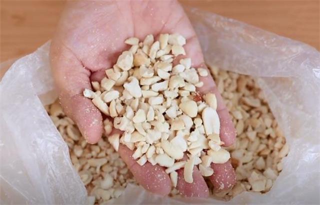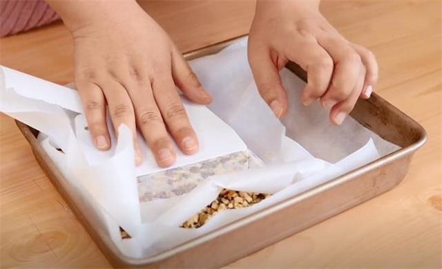 3.都裝到袋子里面,然后用搟面杖敲打成碎塊,這里要注意的是一定不能敲的太碎了,不然會影響整體的一個口感。