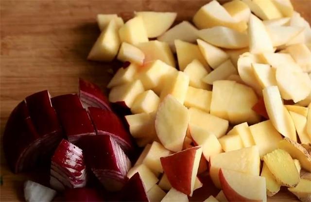 5.把蘋果、梨、洋蔥和姜切成塊。