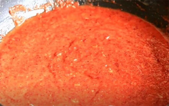 7.鍋里倒入300g辣椒面,倒入剛打碎的泥,用鏟子攪拌均勻。