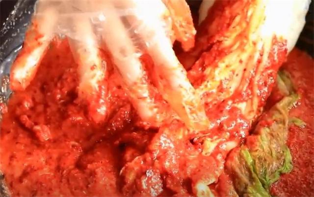 8.把白菜放進去,戴上一次性手套,讓白菜所有地方都裹上辣椒醬。