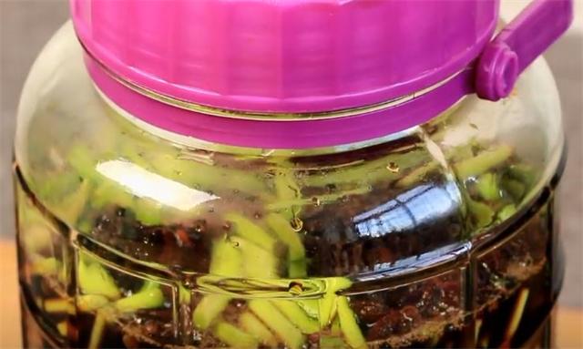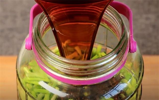 5.放涼后把蒜苔放入瓶子里,要選一個(gè)無(wú)水無(wú)油干凈的大瓶子,蒜苔腌出的水分就不要了,給它倒掉,再把放涼的料汁倒入瓶中,料汁的量一定要沒(méi)過(guò)蒜苔。