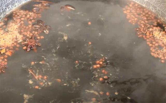 4.腌好后準(zhǔn)備半碗白糖倒入鍋里,加入生抽兩碗,再加入4碗的陳醋,生抽和陳醋的比例大概1:2,加入花椒,再加入八角,然后大火給它煮開(kāi),煮開(kāi)后關(guān)火自然放涼。