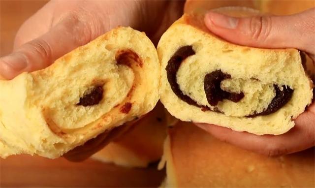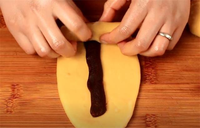 5.案板上抹點油把面團揉下排排氣,均分成6個小劑子,小劑子揉下再搟成牛舌狀,擠上豆沙餡卷起來。