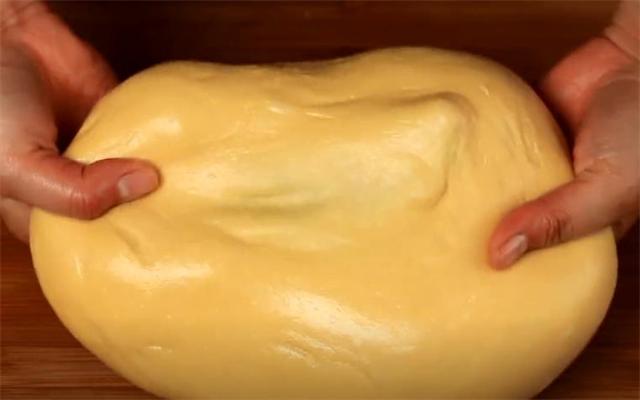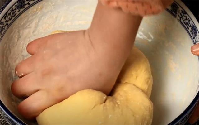 2.揉成面團后放案板上繼續揉,像洗衣服一樣繼續揉10分鐘左右,揉到這樣起膜就可以了。