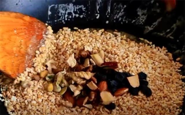 3.鍋里加點水,稍微多加點白砂糖,小火慢熬,熬成香油色后倒入大米,加入自己喜歡吃的干果。