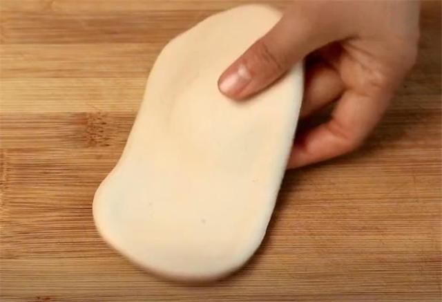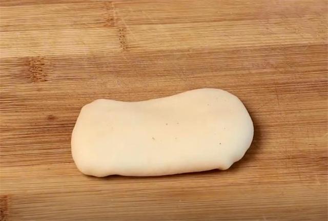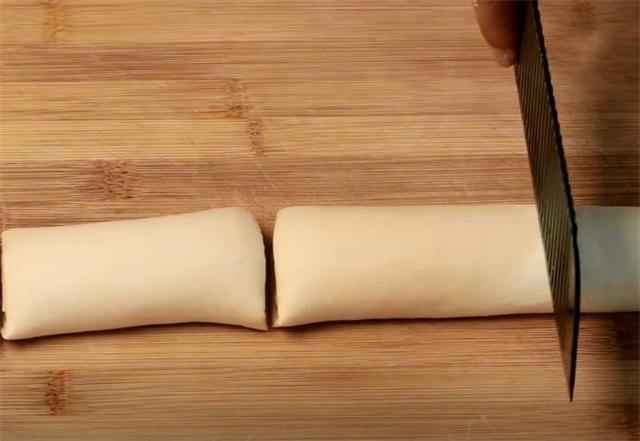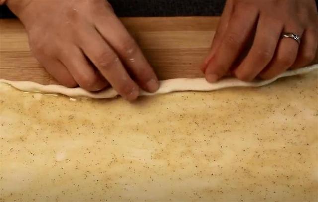 3.面團醒好后揉幾下搟成長方形的薄面皮,面皮盡量搟薄一點,這樣有助于出層,把油酥均勻地刷在面皮上面,然后從一邊慢慢卷起來。