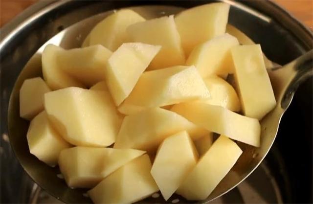 1.土豆去皮,切滾刀塊,放在清水里清洗一遍,然后控干水分。