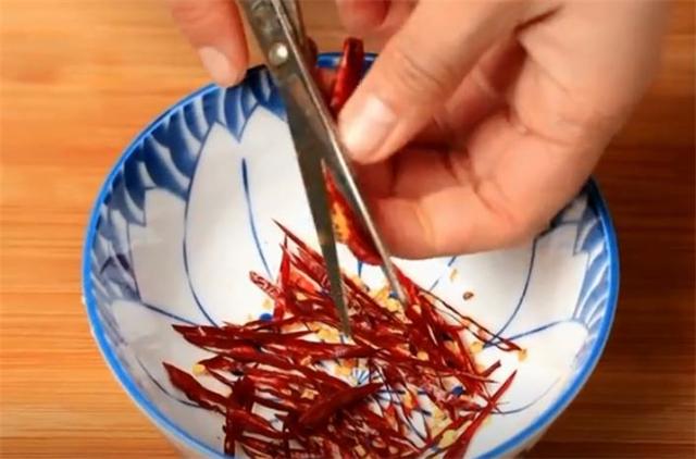 3.把干紅辣椒段用剪刀剪成細絲。