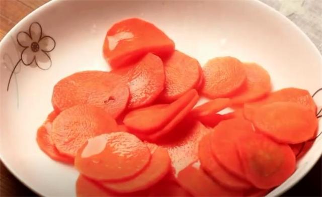 4.把一根洗凈的胡蘿卜去皮后切片,然后下鍋焯水,胡蘿卜片焯軟后撈出。
