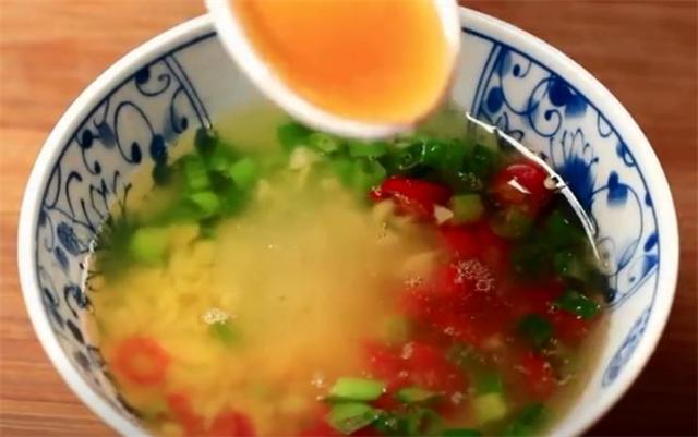 6.起鍋燒油炸點花椒油,花椒油澆到蔥姜蒜末和小米辣上,加入食鹽和白糖,加3勺白醋,再加一勺香油后攪勻。
