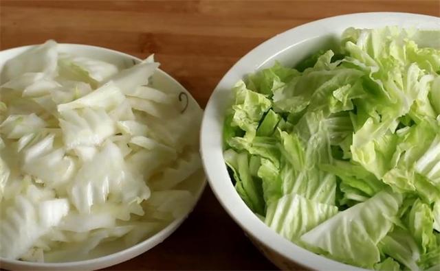 1.先把白菜根部去掉,把葉子扒下來,葉子洗凈后把白菜幫切開,白菜幫斜刀切片,把葉子也切小點。