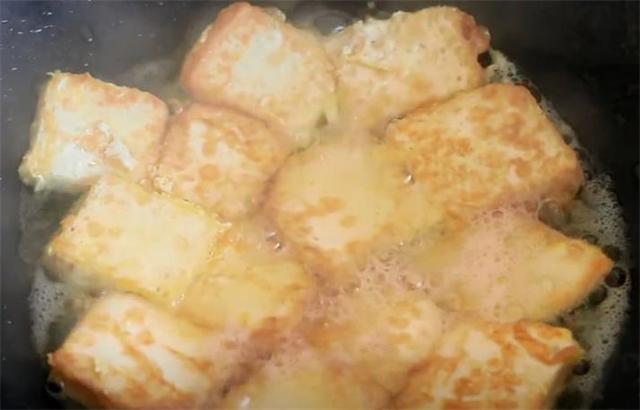 3.鍋里加油燒熱,把豆腐下鍋小火慢煎,一面煎黃后翻面煎,兩面都煎至金黃后出鍋備用。