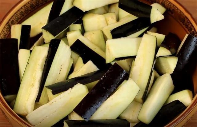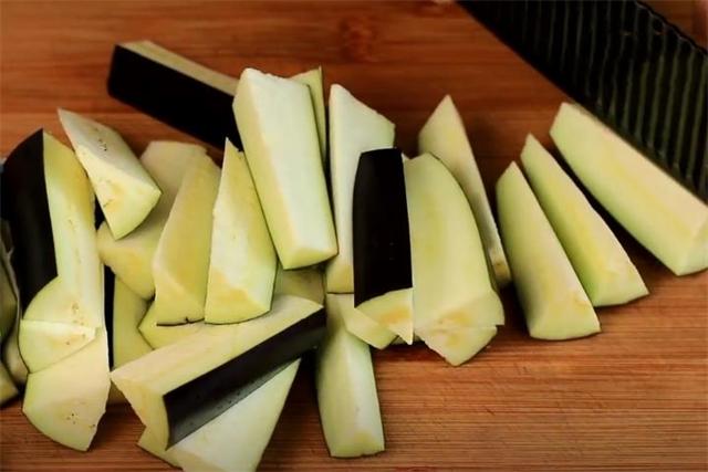 1.先把茄子洗凈后去蒂,切成約4厘米左右的小段,然后切成小條狀。