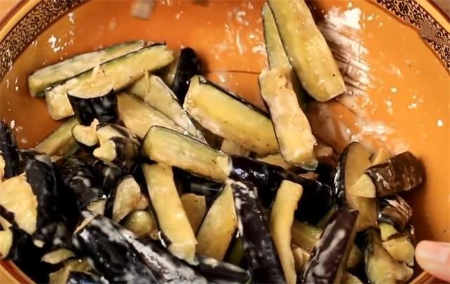 6.把腌好的茄子清洗一遍,洗掉鹽分,然后盡量把里面的水分?jǐn)D出來(lái),擠掉水分的茄子重新放到另一個(gè)盆里,再撒上點(diǎn)淀粉,讓茄子均勻地裹上一層淀粉。