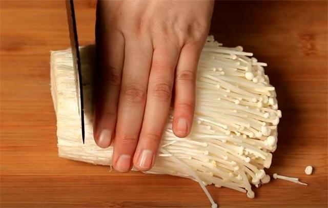 1.先把金針菇的根部去掉,再一塊一塊地切下來,就這樣切薄一點,然后清洗干凈后待用。