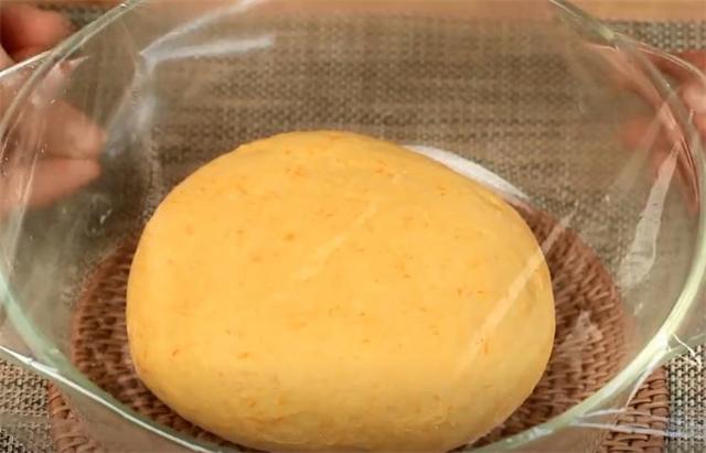 3.準備300g的普通面粉,加少許食鹽和一勺白糖,再加3g的酵母粉,把南瓜泥加進去,再加一勺的食用油,攪拌均勻后揉成面團,然后蓋上保鮮膜醒發至兩倍大。