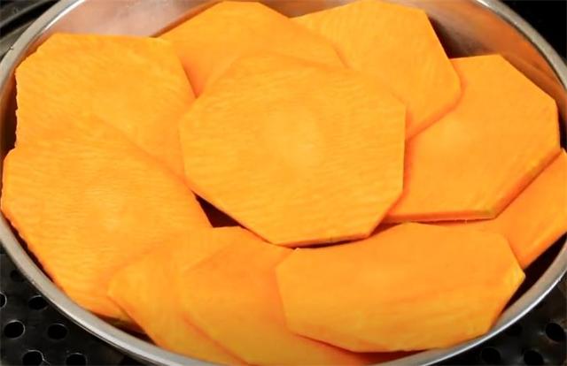 1.首先我們先把南瓜去皮,然后切成薄塊,上鍋蒸12分鐘。