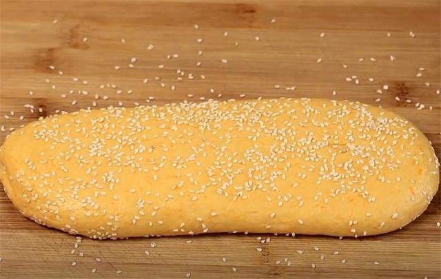 4.面團醒好后案板上抹點食用油,然后揉下排氣,在面團上粘點白芝麻。