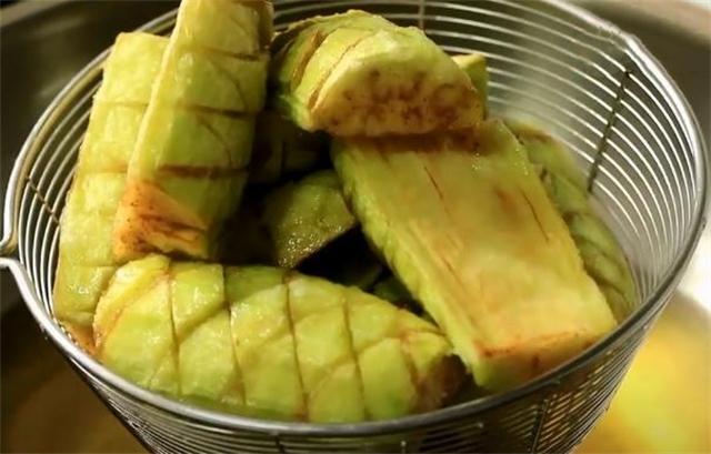 6.油溫六成熱茄子下鍋炸,炸至金黃酥脆撈出控油。
