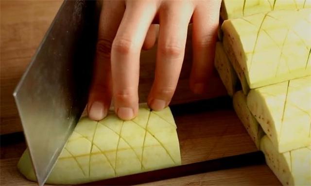 2.兩根筷子各夾住一邊,斜刀切,再換個方向斜刀切。