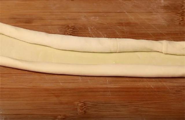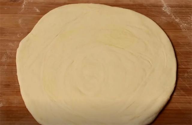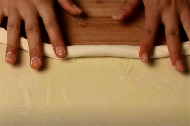 8.把另一頭壓在底部,用搟面杖再搟薄點,搟成這樣就可以了。