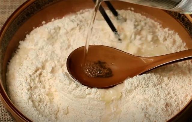 1.先往盆里加入一斤面粉,面粉中間放一個勺子,用400毫升剛燒開的開水邊倒邊攪拌。