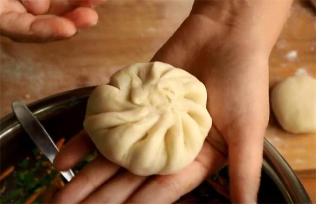 4.面團醒好后揉成長條狀,再切成小塊,搟薄后放上調(diào)好的餡,包起來,把口收緊,防止餡漏,用手按壓一下。