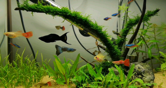 3、水中有青苔的原因:你的水太肥,水里面的營養太多,平時是否放一些營養液,如果放的話,可以考慮減少放入的量;你的魚缸是否有陽光的直射,如果是的話,這也是引起你藻類多的原因,可以適當地移動魚缸的位置,避免陽光的直射。
