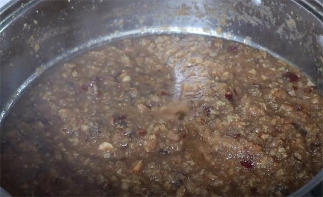 5.接下來把梨汁全部倒進大鍋里面熬,加入切碎的紅棗,再加入羅漢果、川貝、胖大海,還有20g的甘草,再加一小把的陳皮進去,開大火煮開,這里用到的羅漢果、川貝、胖大海、甘草,在藥店里面都可以買到,鍋里煮開后再轉中小火繼續(xù)熬一個多小時,慢慢地將這些材料里的性能都充分地熬出來,熬的時候一定要多攪拌攪拌,防止粘鍋,一直熬到這個程度關火,放一旁晾涼一會兒。