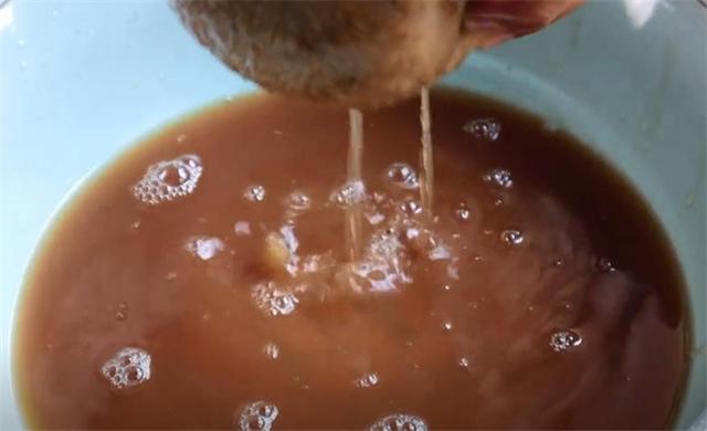 6.然后舀入細的紗布里面,或者倒進網袋里面過濾,把里面的梨汁擠到盆里面。